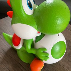 En Yoshi-figur från Super Mario-serien. Figuren är grön med vita detaljer och orangea fötter, sittandes på en gul bas.