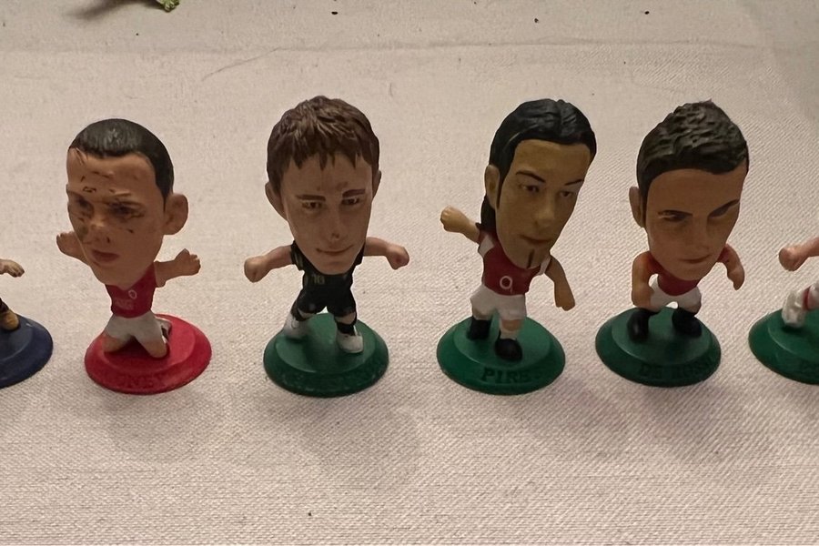 Set med 8 fotbollsfigurer. Varje figur står på en rund bas med spelarens namn ingraverat. Figurerna är klädda i olika klubblagsdräkter.