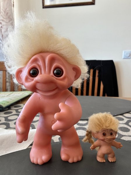 Två troll dockor med hår. En större och en mindre, den stora är märkt Dam Made In Denmark 1977, den lilla Dam Made in Denmark. Båda är original av Thomas Dam.