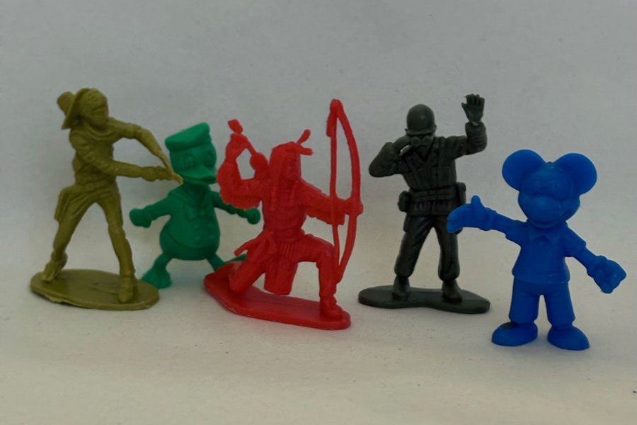 Detta parti innehåller 5 figurer i olika färger och utföranden. Figurerna inkluderar en cowboy, en kalle anka, en indian, en soldat och Musse Pigg.
