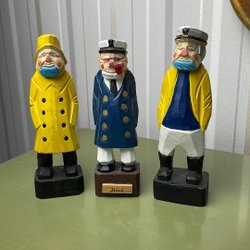 Tre dekorativa träfigurer. Perfekt för samlaren eller som en unik inredningsdetalj.14cm höga En skridskodansare är trasig vid skridskorna