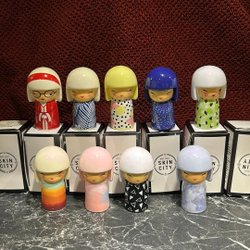 En samling av nio traditionella japanska Kokeshi dockor. Varje docka är unikt designad med olika färger och mönster. Perfekt för samlare eller som en dekorativ detalj i hemmet.Skin City