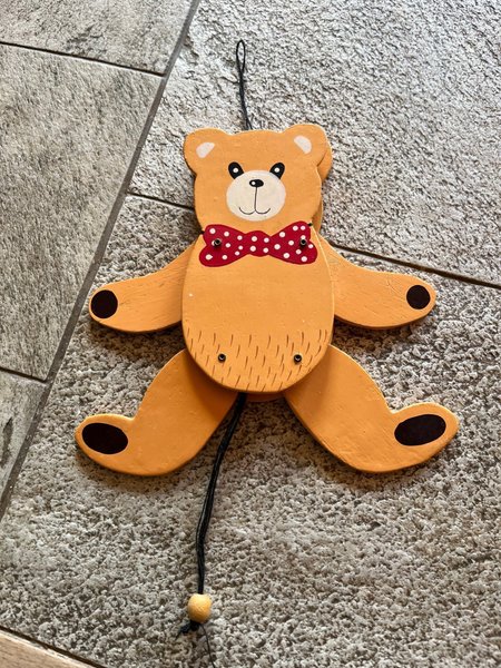 Denne uro er formet som en bamse i træ. Den har bevægelige arme og ben, der styres af en snor forneden. Bamsen er orange med en rød butterfly med hvide prikker.