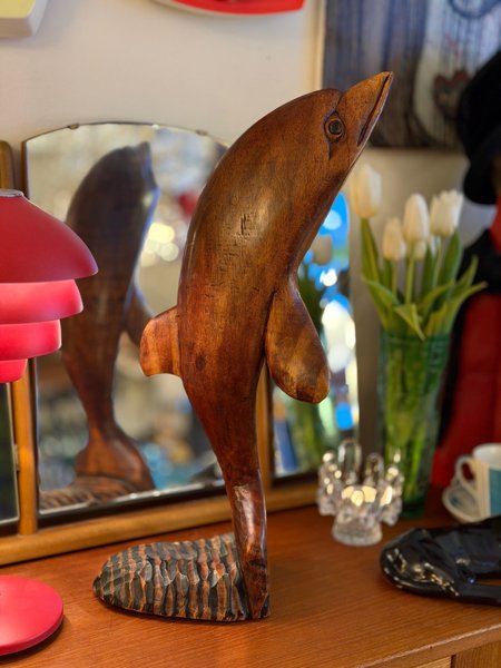 Dekorativ träskulptur föreställande en delfin. Perfekt som inredningsdetalj. Höjd 53 cm, fot 19x14 cm.