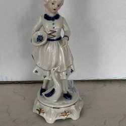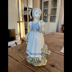 En söt porslinsfigur föreställande en flicka. Figuren är detaljerad med en blå klänning och ett förkläde. Perfekt som dekoration eller samlarobjekt.
