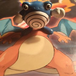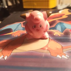 En Igglybuff figur från Pokémon. Figuren är rosa med röda ögon och en spiral på pannan. Den har små utskott på huvudet som liknar hår. På baksidan av figuren står det "© 2002 Nintendo" instansat.
