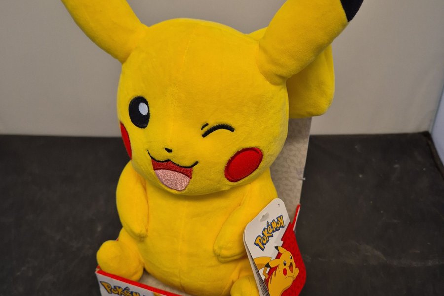 Pikachu gosedjur med gula öron och svarta toppar. Gosedjuret har röda kinder och en öppen mun med tungan ut. Pikachu sitter i en kartong med Pokémon-logotypen.