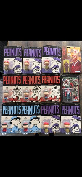 Peanuts action figurer med Schroeder, Linus og Lucy. Derudover Solar action figur og Agnostic Front action figur. Alt på billedet sælges samlet for kun