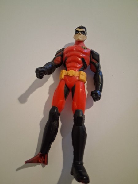 Actionfigur föreställande Robin i röd och svart dräkt med gult bälte. Figuren har rörliga armar. Inte bara ful utan som synes också med trasig fot.