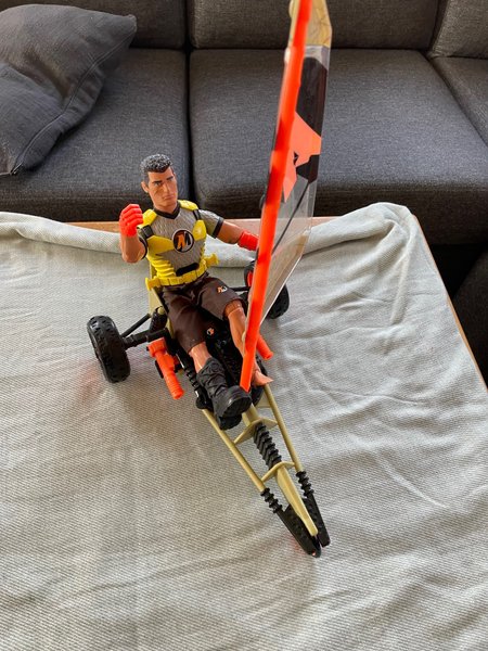 Actionfigur med tillhörande fordon. Figuren är klädd i en gul och grå topp, bruna shorts och svarta skor. Fordonet har tre hjul och ett segel i orange och svart.