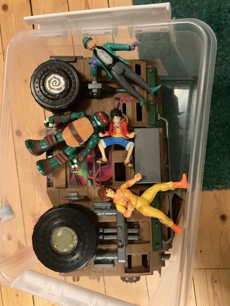 Ett set med actionfigurer och ett fordon. Innehåller figurer som Teenage Mutant Ninja Turtles, The Riddler, Monkey D. Luffy och en figur i gul April Oneal