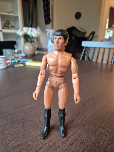 Star Trek Spock actionfigur. Figuren har rörliga leder och svarta stövlar. Spock har sin klassiska frisyr och spetsiga öron.