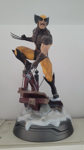 Wolverine staty från X-Men. Figuren är detaljerad och visar Wolverine i sin klassiska dräkt med klorna utfällda. Basen föreställer ett snöigt landskap med trädetaljer.