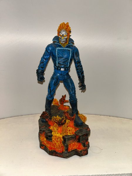 En detaljerad figur av Ghost Rider i blått, stående på en bas av eld och sten. Figuren är en samlarobjekt.