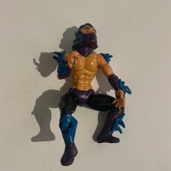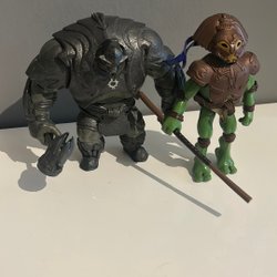 Två Yugioh figurer med tillbehör. Figurerna är detaljerade och har rörliga leder. En av figurerna är klädd i en lång svart rock med gröna och gula detaljer, och den andra figuren är muskulös med grön rustning och rosa detaljer, samt ett stort vapen. Ett löst vapen i form av en yxa med ett brunt handtag och ett ljusblå klot.