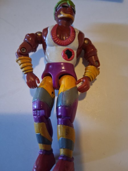 Actionfigur med rödbrun kropp, vit överdel med röd och svart detalj, lila shorts och ben i gult, lila och grått. Figuren har gula armband och ett rött halsband.