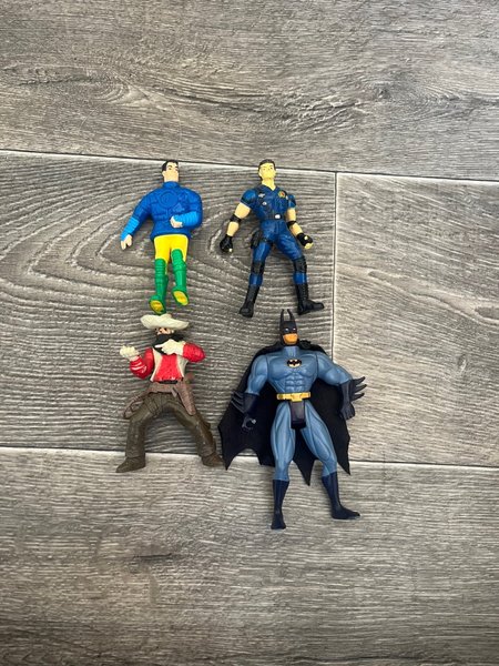 Detta set innehåller fyra actionfigurer. En figur är klädd i blå jacka och gula byxor. En annan figur är klädd i blå uniform. En tredje figur är en cowboy med hatt och röd skjorta. Den fjärde figuren är Batman i sin klassiska dräkt med mantel.