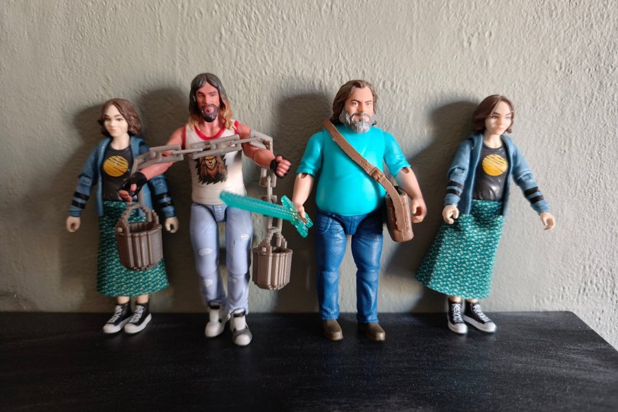 Fyra Minecraft Dungeons Hero Pack figurer. Två kvinnliga figurer och två manliga figurer. En av de manliga figurerna har en kedja och ett svärd. Den andra manliga figuren har en väska.