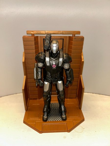 War Machine actionfigur med vapen på ryggen. Figuren är svart och silver med röda detaljer. Den står på en brun bas.