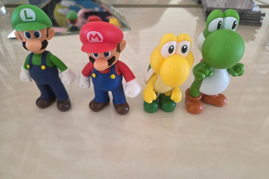 Set med fyra Super Mario-figurer. Innehåller karaktärerna Luigi, Mario, Koopa Troopa och Yoshi. Figurerna är redo för lek eller samling.