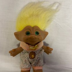 Två Monchichi apor från K.E Mathiasen A/S säljes. Den ena apan har en vit mössa med jordgubbsmönster och spetsdetaljer. Den andra apan har blå jeans på sig. Etiketter finns på båda aporna. Skick enligt bilder