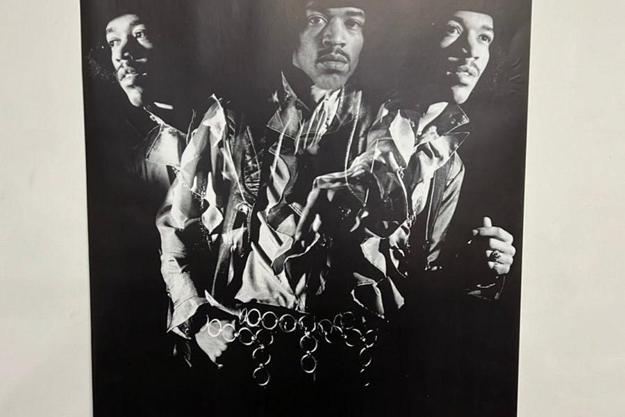 En svartvit poster med Jimi Hendrix.