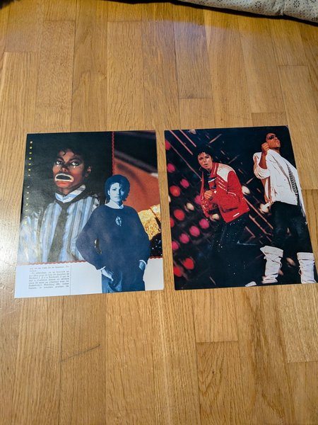 Två affischer med Michael Jackson. Den ena affischen visar Michael Jackson i olika utklädnader, inklusive en clownsminkning. Den andra affischen visar Michael Jackson i scenkläder, en röd jacka och en vit jacka.