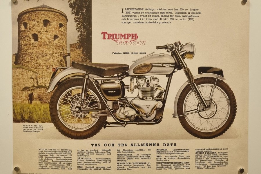 Affisch med en Triumph Trophy motorcykel. Den beskriver modellen TR5 och TR6 med allmänna data, inklusive motor, växellåda, bromsar och elektrisk utrustning. Den innehåller även information om Bohus Fästning.