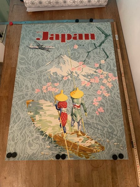 Affisch med motiv av Japan. Föreställer två personer i en båt med berg och körsbärsblommor i bakgrunden, samt ett flygplan. Affischen har texten "Japan" i rött överst.