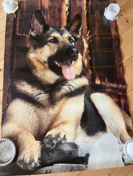 Vintage Affisch med en schäferhund. Bilden visar hunden liggandes med tungan ute. Bakgrunden är i trätoner.