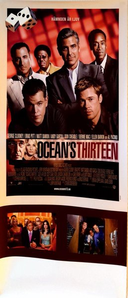 Affisch med motiv från filmen Ocean's Thirteen. Skådespelare som George Clooney, Brad Pitt, Matt Damon, Andy Garcia, Don Cheadle, Bernie Mac, Ellen Barkin och Al Pacino syns på affischen.