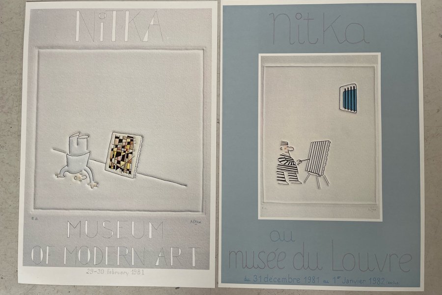 Två affischer av Nitka. Den ena affischen annonserar en utställning på Museum of Modern Art 29-30 februari 1981. Den andra affischen annonserar en utställning på Musée du Louvre 31 december 1981 till 1 januari 1982.