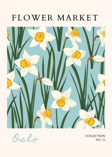 En affisch med blomstertema. Den har en ljusblå bakgrund med vita och gula blommor och gröna stjälkar. Affischen har texten "FLOWER MARKET" högst upp och "COLLECTION NO. 24" längst ner.