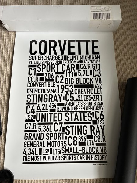 Affisch med texten ”Corvette” och olika Corvette-relaterade termer och modeller