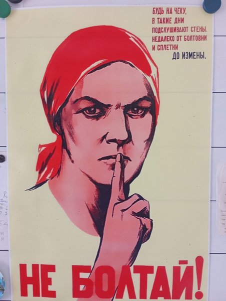 En sovjetisk propaganda poster med texten "Var tyst!". Postern har ett motiv av en kvinna med ett finger framför munnen.