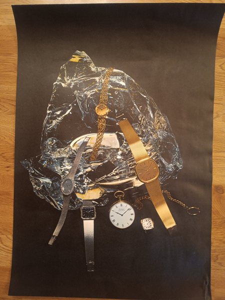 Affisch med motiv av olika klockor. Klockorna är i olika stilar och färger, inklusive guld och silvertoner. Motivet är placerat mot en mörk bakgrund med ett glänsande, veckat material som reflekterar ljus.