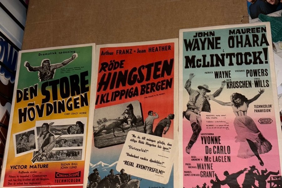 Tre filmaffischer: Den Store Hövdingen, Röde Hingsten I Klippiga Bergen, McLintock!