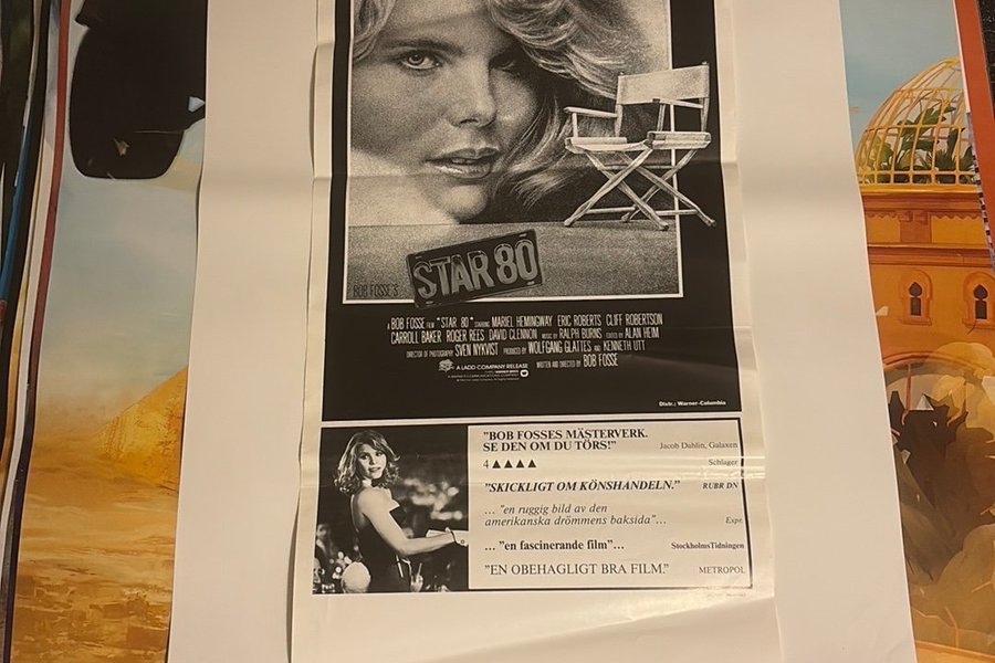 Affisch för filmen Star 80. Affischen har texten "Det brutala slutet på en Hollywoodsaga" och "Bob Fosses mästerverk. Se den om du törs!" samt recensioner som "Skickligt om könshandeln" och "En obehagligt bra film".