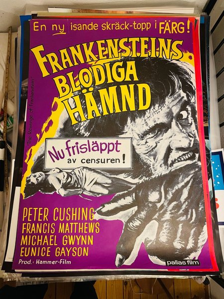 Affisch för filmen "Frankensteins Blodiga Hämnd" (The Revenge of Frankenstein). Medverkande skådespelare är Peter Cushing, Francis Matthews, Michael Gwynn och Eunice Gayson. Produktionen är av Hammer-Film och distribueras av Pallas Film.