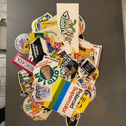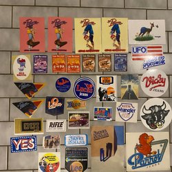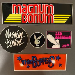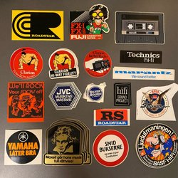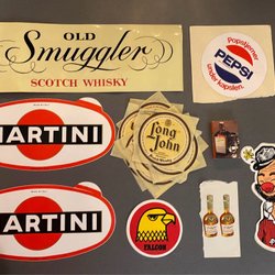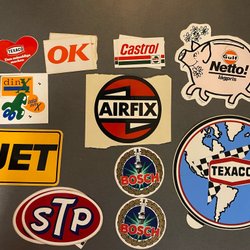 Diverse klistermärken med motiv som racing, bilar, och varumärken som Volvo, Saab, Bosch, Firestone, Marlboro, Lee Cooper och andra.