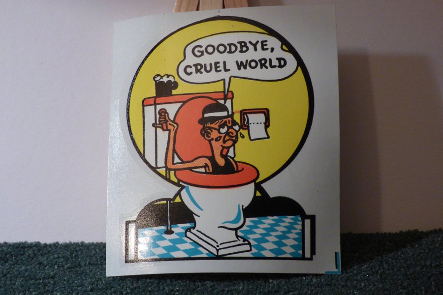 Ett klistermärke med en tecknad figur som sitter på en toalettstol och säger "Goodbye, cruel world". 8,5 x 10 cm