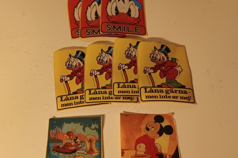 Samling av Disney märken med Kalle Anka, Farbror Joakim och Musse Pigg. Tror det är klistermärken.