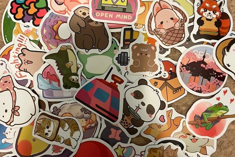 Ett gäng klistermärken med olika motiv.
