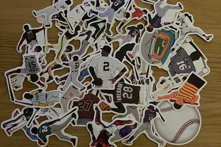 Ett ark med baseballklistermärken med olika spelare och basebollrelaterade motiv.