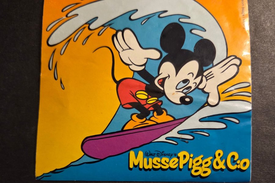 Bild med Musse Pigg surfandes på en våg. Texten "Walt Disney's Musse Pigg & Co" finns nedtill på bilden. Bilden är märkt "© Walt Disney Productions" och "Medföljer som bilaga i Musse Pigg & Co".