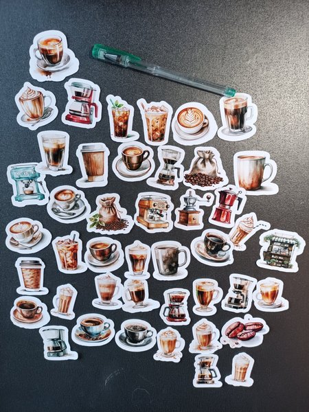 Ett set med kaffe-tema klistermärken. Innehåller bilder av olika kaffedrycker, kaffebönor och kaffebryggare.