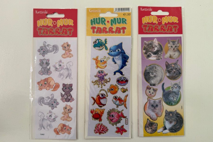 Tre ark med Hur-Mur Tarrat klistermärken. Ett ark med kattungar, ett ark med fiskar och andra havsdjur, och ett ark med katter.