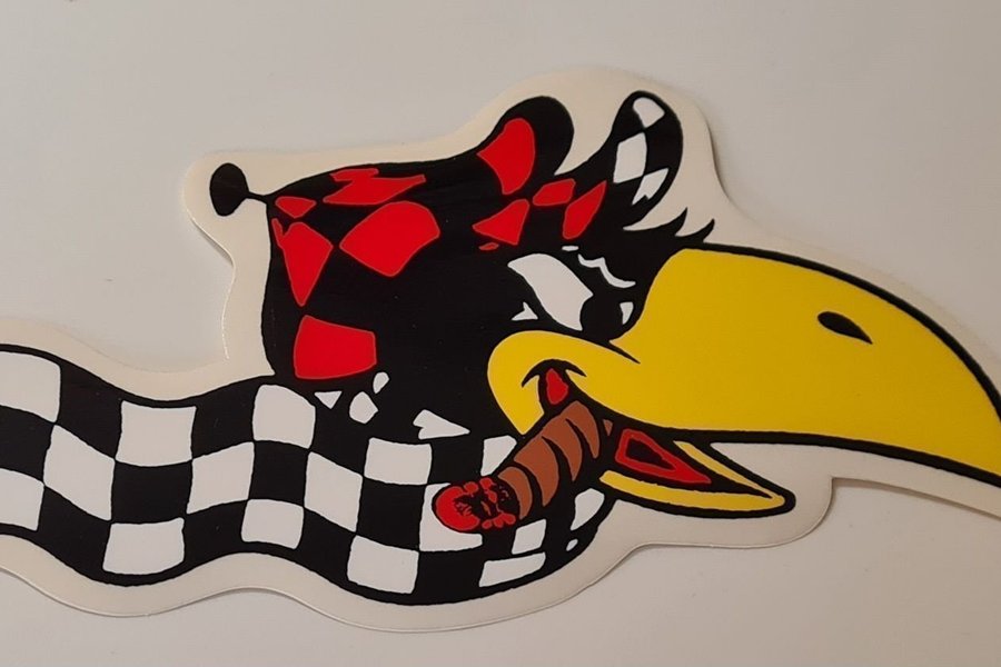 Retro Seriefigur Hacke Hackspett med cigarr och pupitarutor. Storlek 18x11 cm. Klistermärke i Nyskick. Samfraktar
