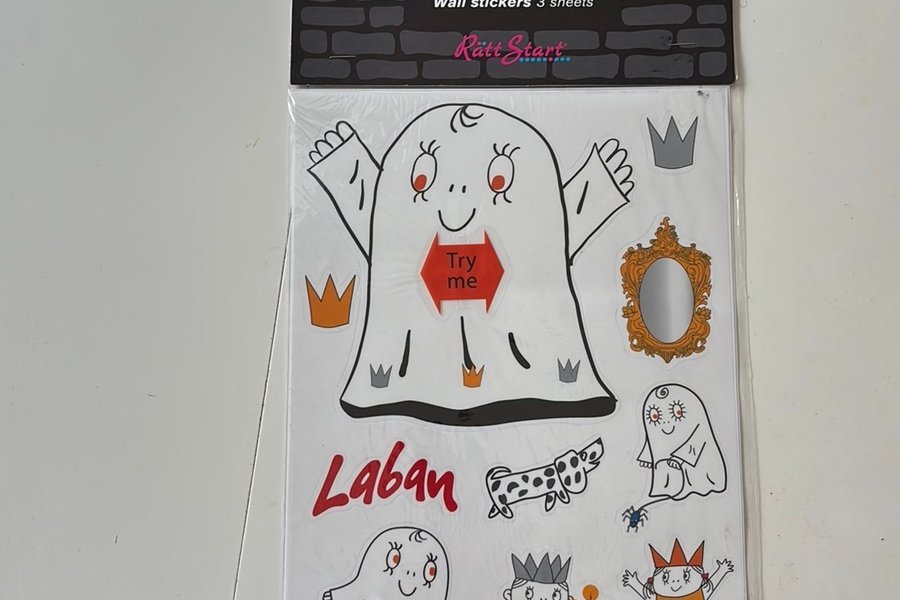 Väggdekaler med motiv från Laban. Förpackningen innehåller 3 ark med olika dekaler, inklusive spöken, kronor och andra figurer. Perfekt för att dekorera barnrummet.