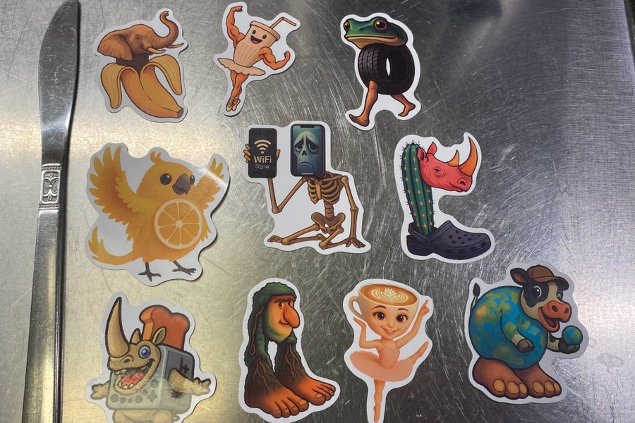 Diverse klistermärken med roliga motiv av de udda Brainrot figurerna de på bilden ingår.